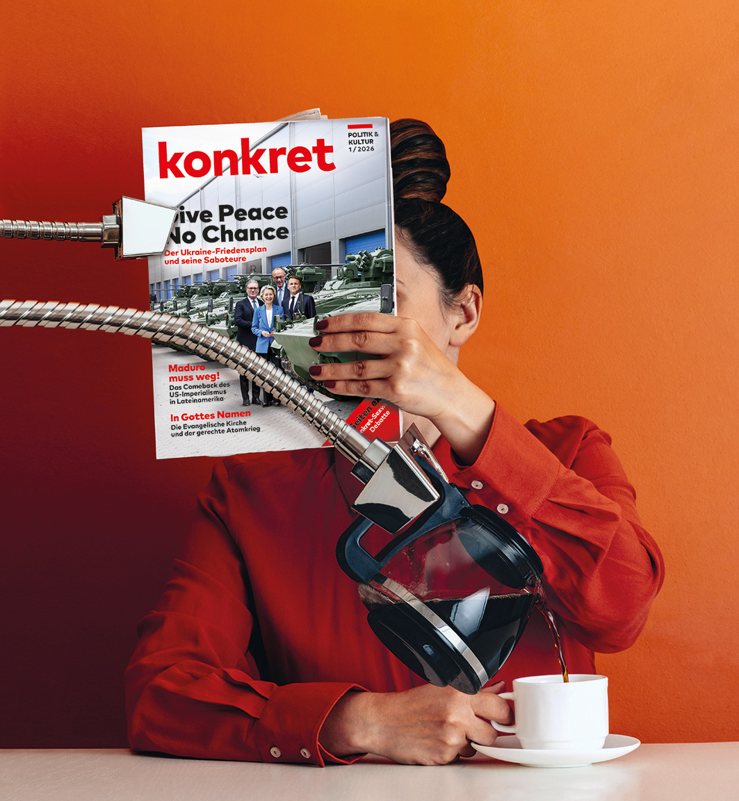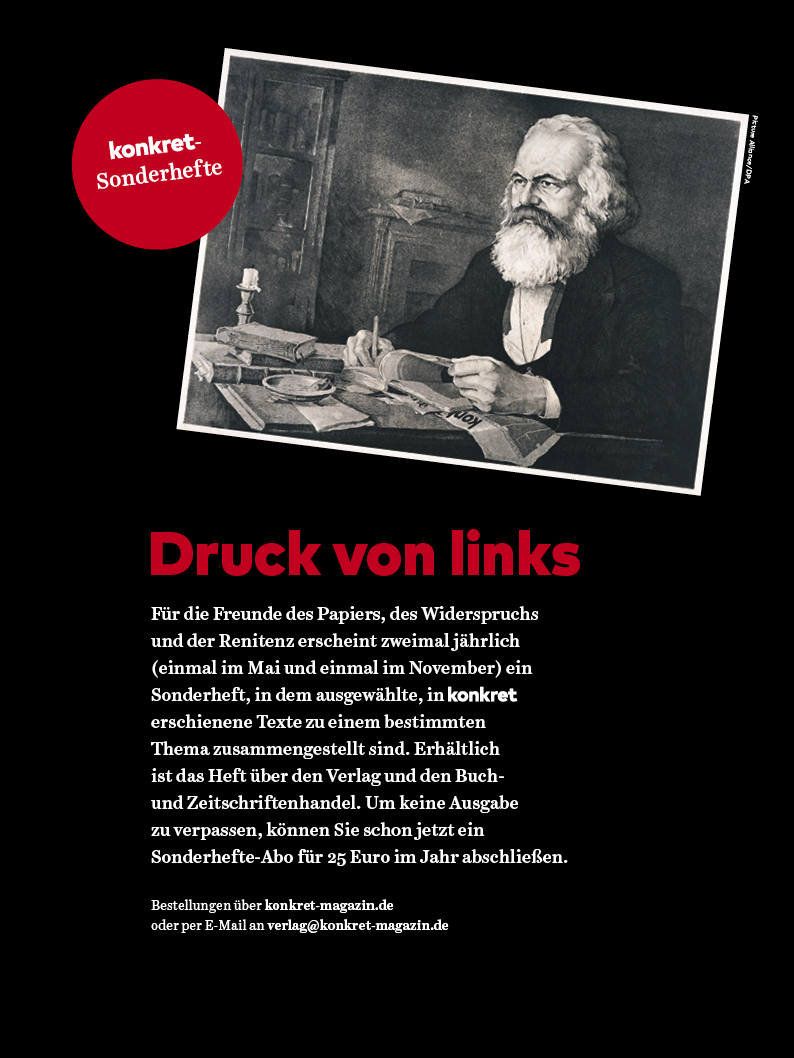 konkret-Leser/innen, die es sich leisten können und wollen, mit dieser Zeit nicht mit zu gehen, können sich beim Verlag melden und ihr Interesse daran bekunden, dsas gedruckte Heft für 180 Euro im Jahr (15 Euro pro Heft) zu abonnieren. Ab 1.000 Interessenten machen wir wieder Druck. Stand Anfang März haben sich bereits 450 Interessierte gemeldet. Anfragen per E-Mail an verlag[at]konkret-magazin.de oder an KVV konkret, Postfach 50 04 09, 22704 Hamburg