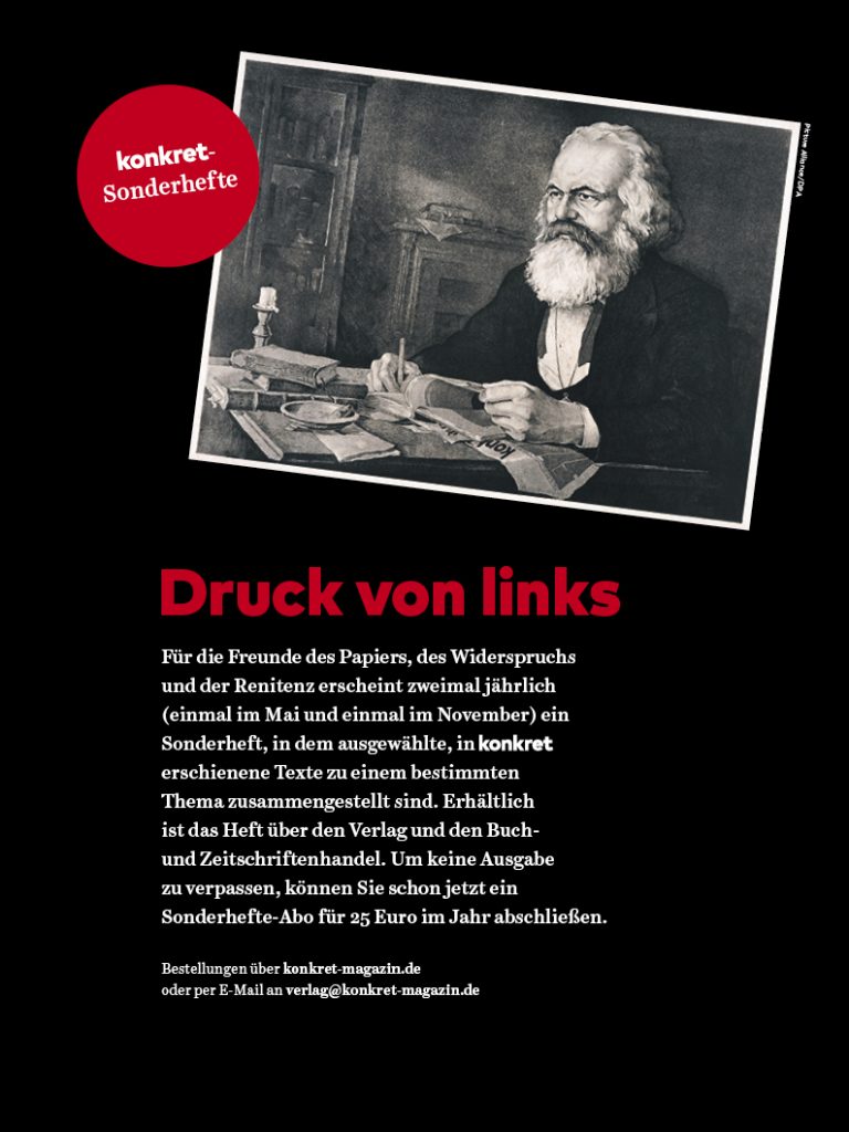 konkret-Leser/innen, die es sich leisten können und wollen, mit dieser Zeit nicht mit zu gehen, können sich beim Verlag melden und ihr Interesse daran bekunden, dsas gedruckte Heft für 180 Euro im Jahr (15 Euro pro Heft) zu abonnieren. Ab 1.000 Interessenten machen wir wieder Druck. Stand Mitte Januar haben sich bereits 400 Interessierte gemeldet. Anfragen per E-Mail an verlag[at]konkret-magazin.de oder an KVV konkret, Postfach 50 04 09, 22704 Hamburg