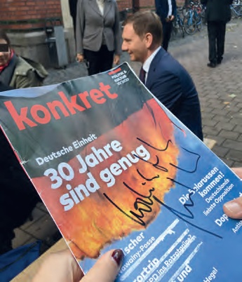 Der Wahlkampf Kretschmers bestand vor allem darin, durch Sachsen zu tingeln und der dort ansässigen besorgt-wütenden Bevölkerung zu versichern, dass sie nicht die Schmutzkonkurrenz wählen müsse, damit Kanaken draußen bleiben und die, die schon hier sind, nach deutscher Sitte drangsaliert werden: »Die großen europäischen Ideen, Frieden und Zusammenhalt, haben an ihrer Richtigkeit nichts verloren. Aber heute treiben die Menschen andere Themen gerade stärker um: Grenzkriminalität, Migration, auch das Urheberrecht.« Dass Kretschmer einer konkret-Leserin ein Autogramm gab, und zwar ausgerechnet auf der Ausgabe, deren Titel noch einmal klarstellt, was von den Deutschen, ihren großen Herzen und dem, was sie umtreibt, zu halten ist, nährt den Verdacht, er könnte zu allem Überfluss auch noch brunzdumm sein.